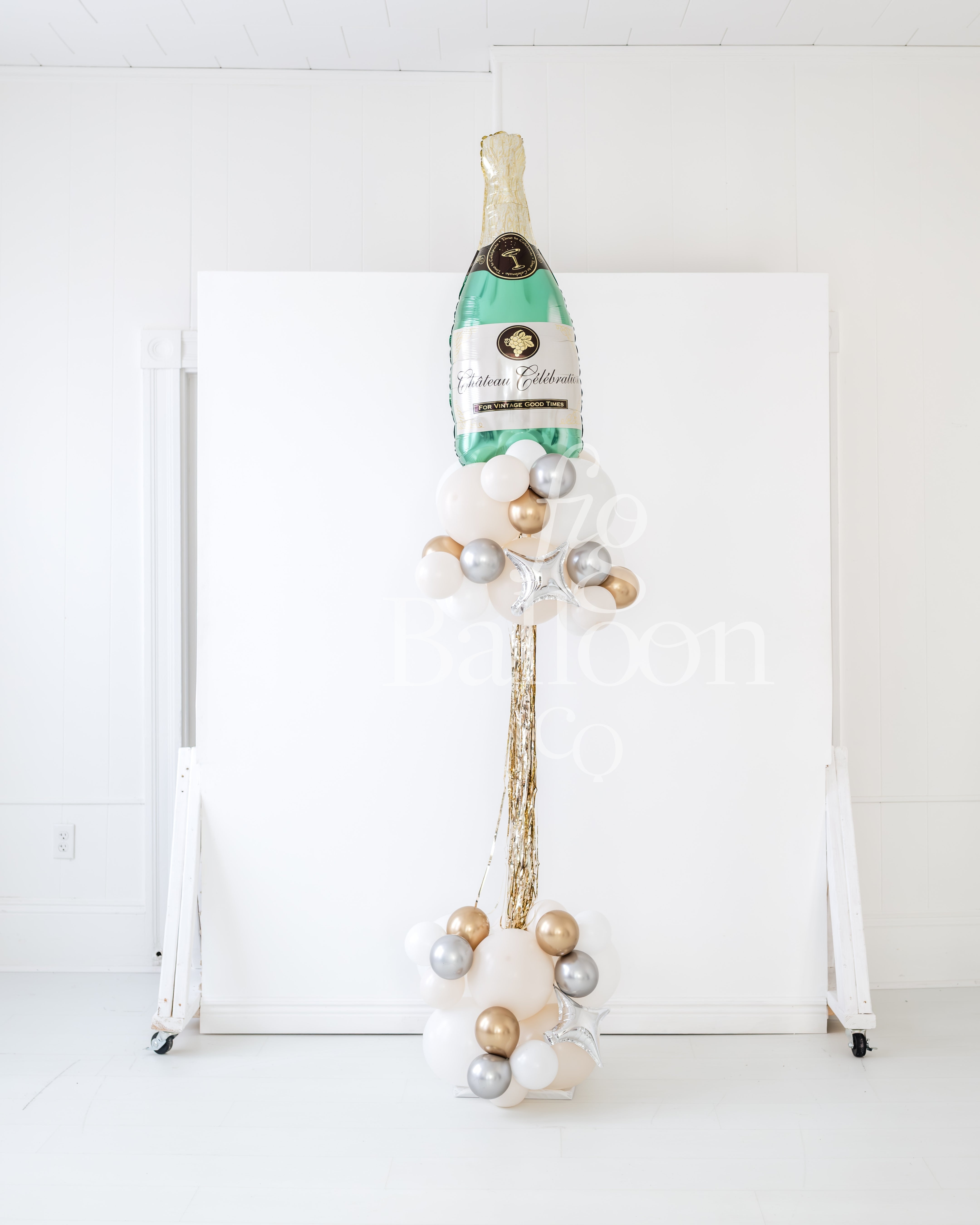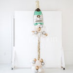 Includes: (4) Pre-built and inflated party poles with matching fringe tail (stand is yours to keep!) with mylar champagne balloon attached to the top!