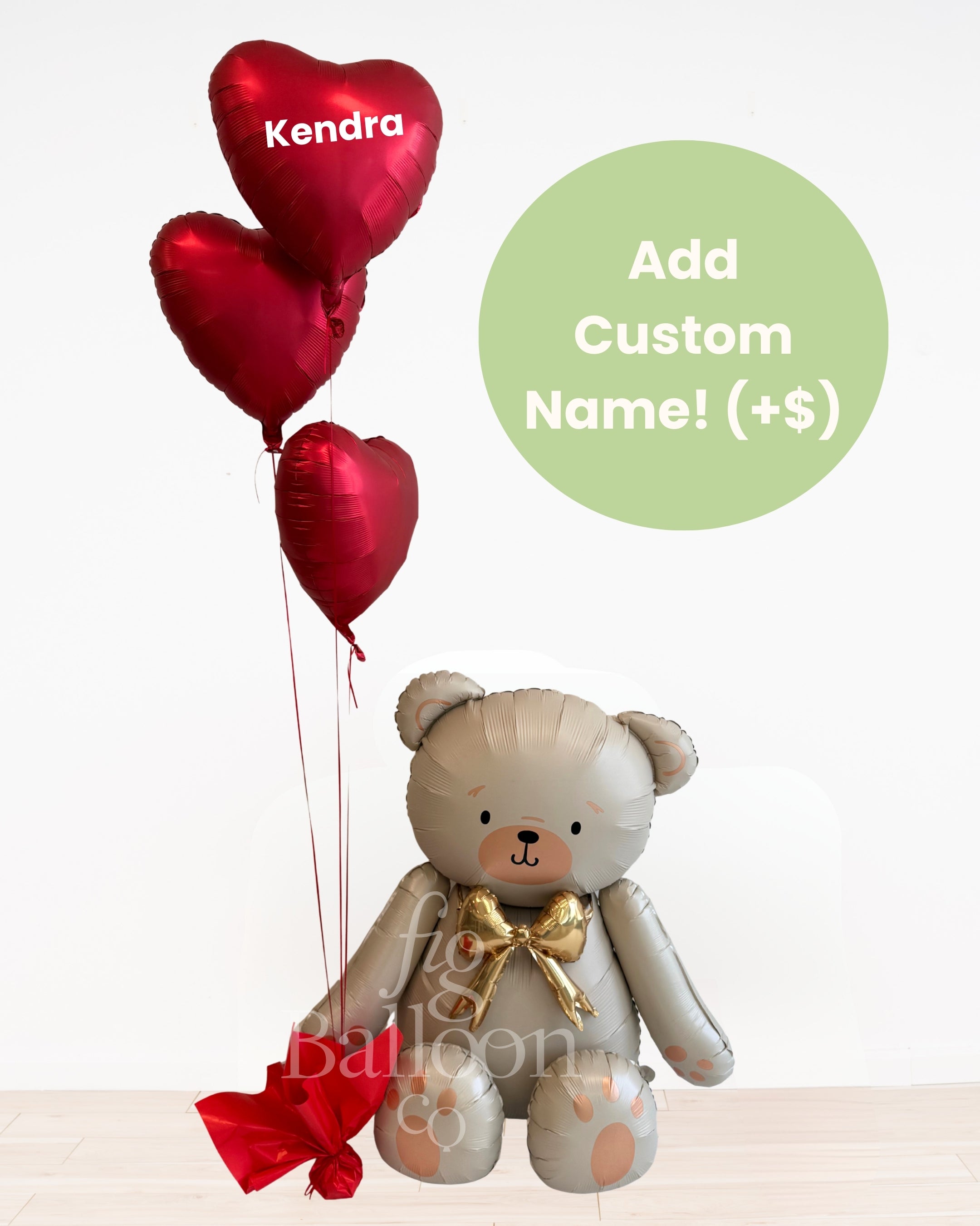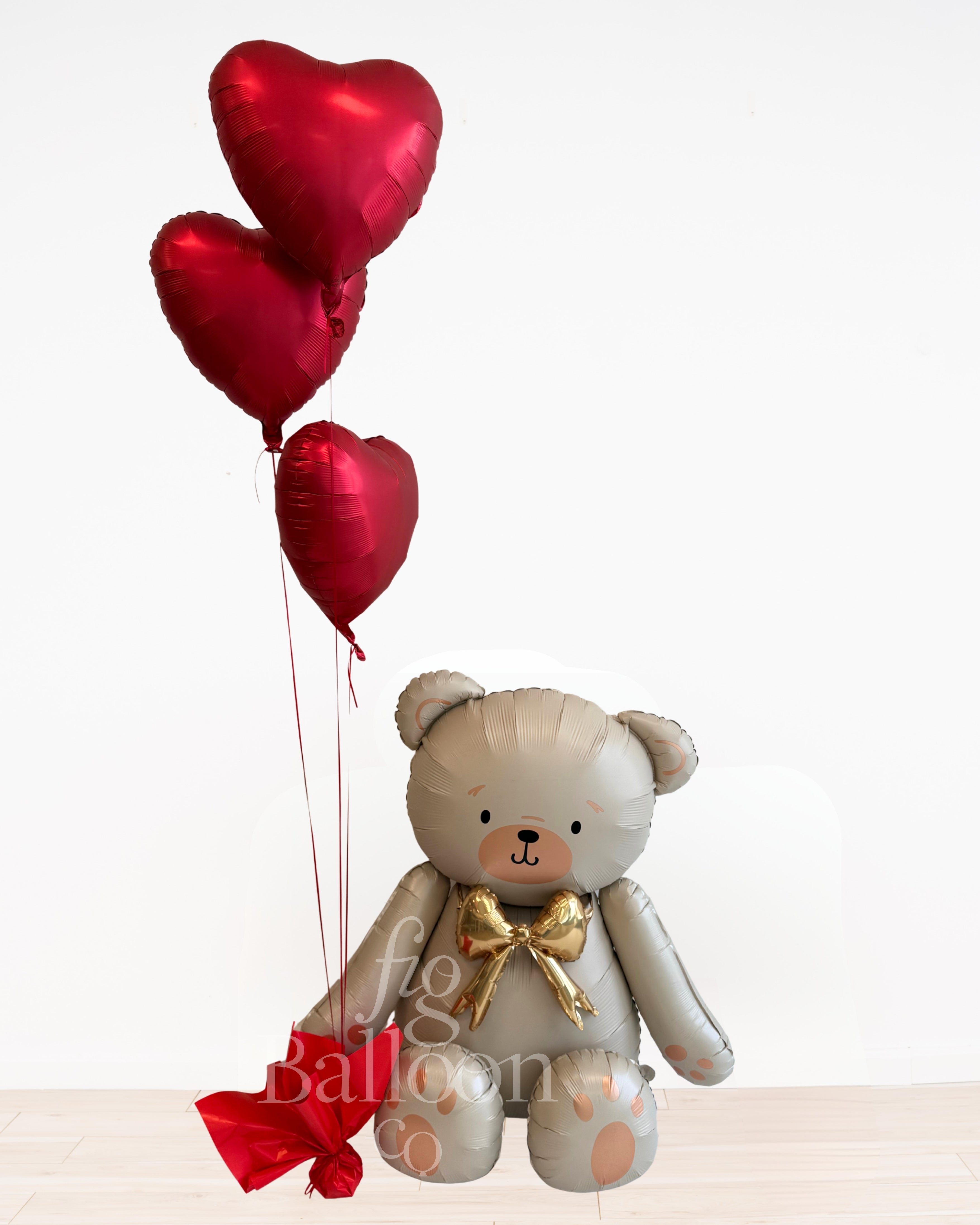 Includes: Teddy Bear Balloon (air filled, does not float) & (3) red heart helium (floating) balloons, with satin red ribbon and balloon weight.