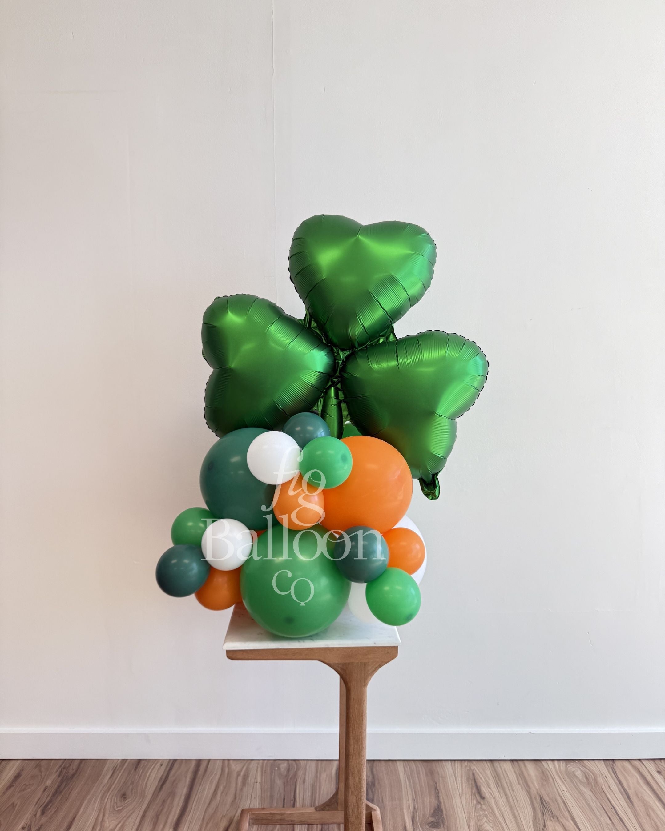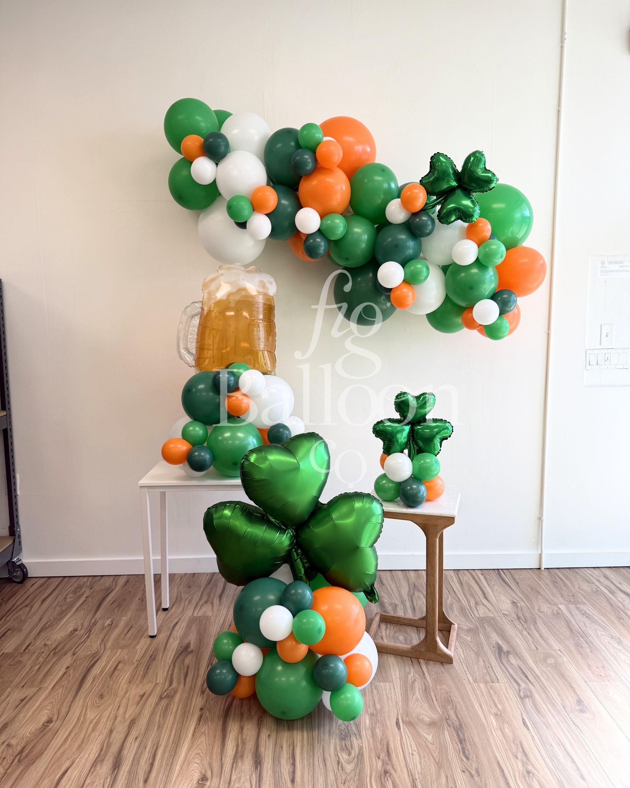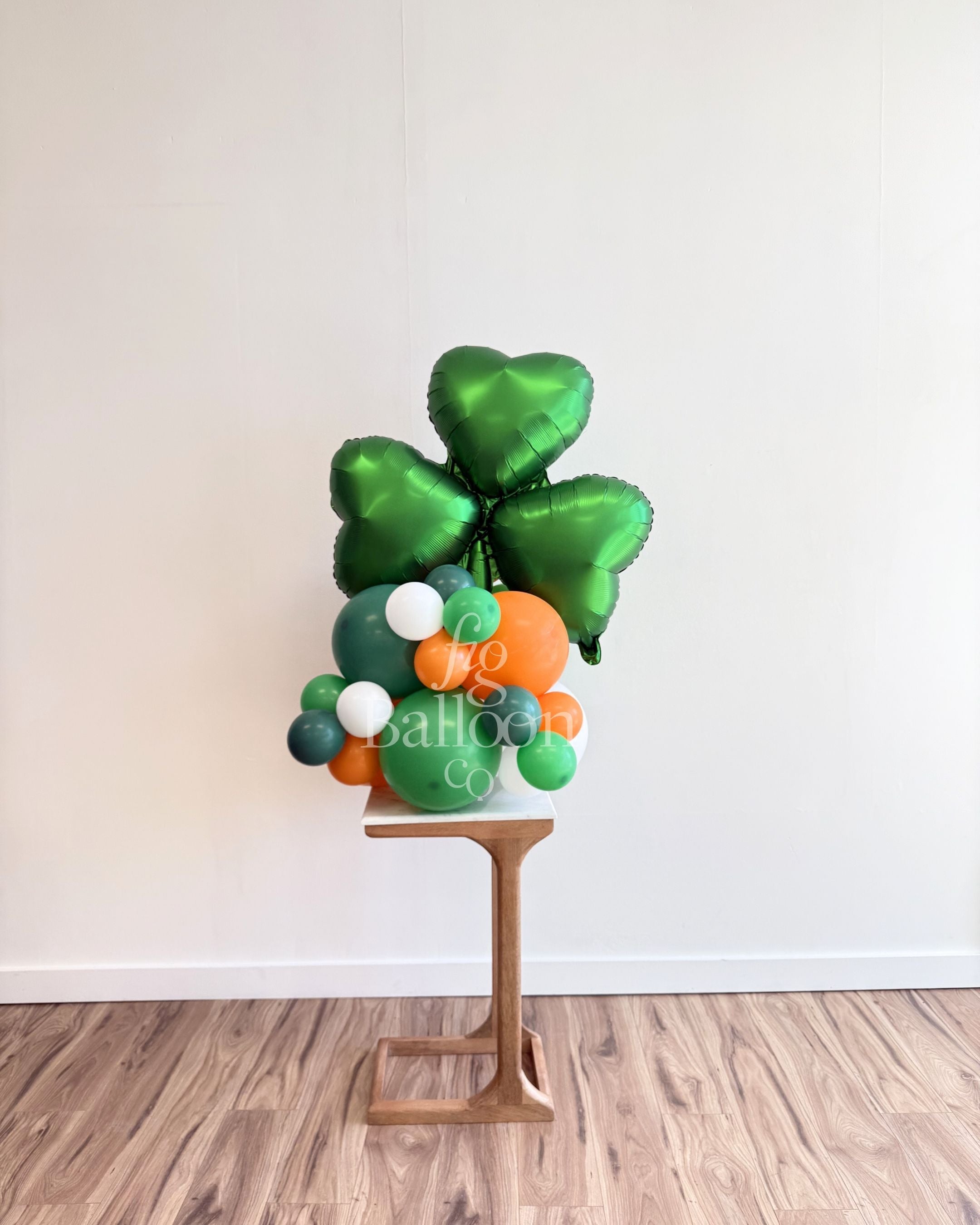Includes: Pre-built and inflated balloon stack with shamrock balloon topper.