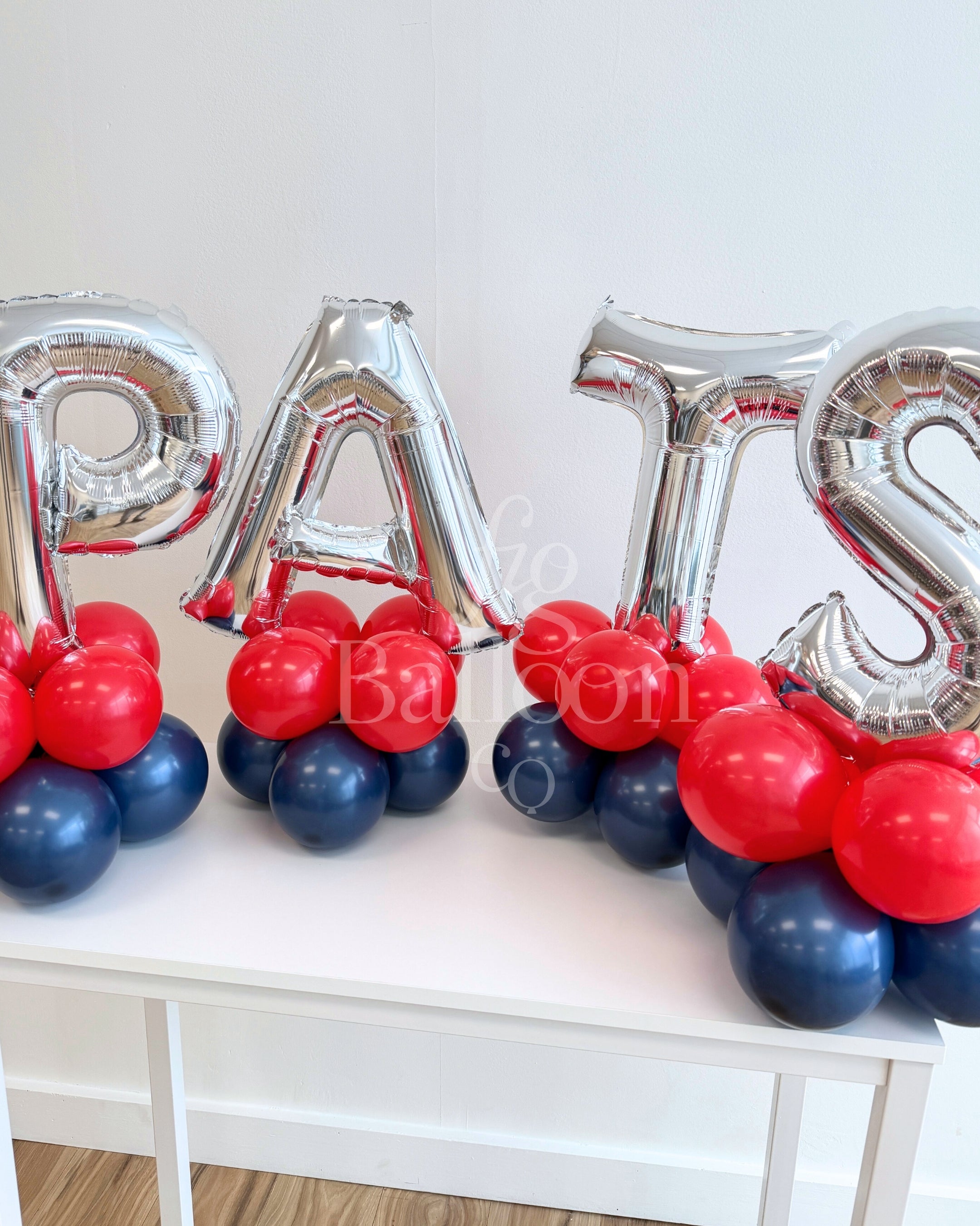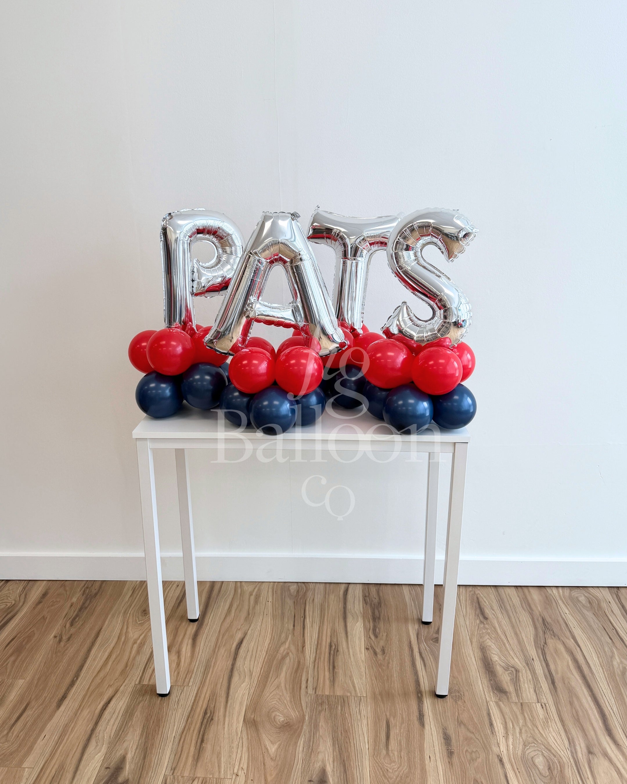 Includes: (4) Pre-built and inflated balloon stacks with mylar "PATS" letter balloons attached. Each stack is weighted to help it stay put!